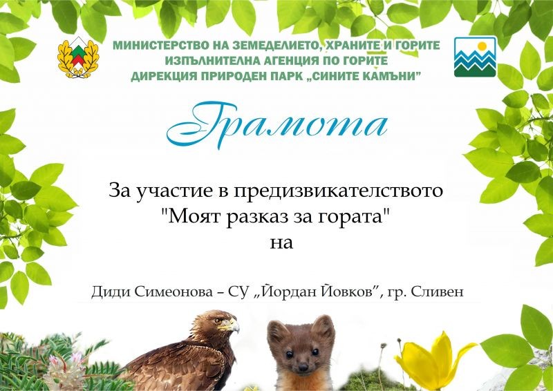 Ученици от СУ "Йордан Йовков" - Сливен се включиха в конкурса "Моят разказ за гората", организиран от ПП "Сините камъни".