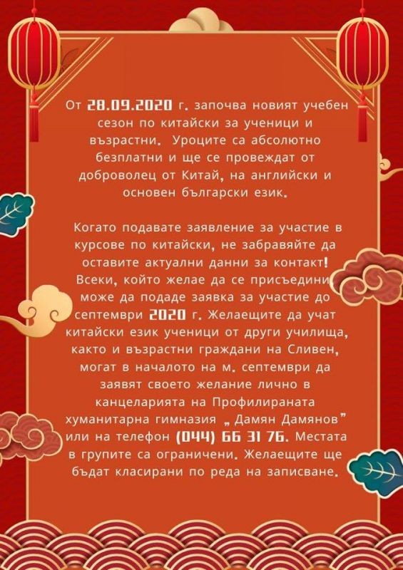 Ли Юнхан – Лия, е доброволка от Китайската народна република, която от средата на лятото е в Сливен. С началото на новата учебна година тя ще продължи дейността на предшественичките си Пени, Ячи, Джени и Сам Ди в Профилираната хуманитарна гимназия „Дамян Дамянов”. Отново, освен часове по китайски език и култура за възпитаниците на хуманитарната гимназия, се предвижда възможността китайски език да учат и ученици от други училища, както и възрастни граждани на Сливен. В следващите дни те следва лично да заявят своето желание в канцеларията на гимназията или на телефон (044) 66 31 76.