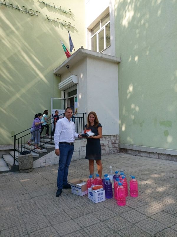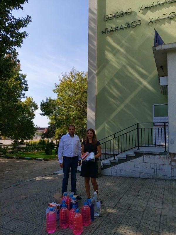 Дарението включва три вида дезинфектанти – за под, за учебните чинове и за ръце, както и кутии с предпазни маски за деца и възрастни.