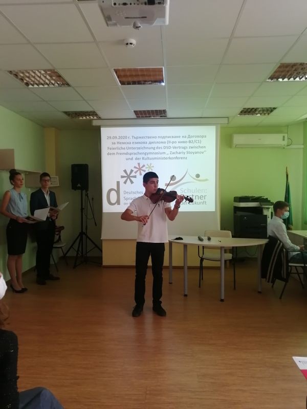 Договорът за издаването на немската езикова диплома от ПГПЗЕ „З. Стоянов“ бе предварително одобрен от правителството на ФРГ. Той бе сключен на кратка церемония в РУО от главния консултант и координатор по немски език за България Бернд Бухолц и директорката на гимназията Ефросина Кисьова. Културното аташе в посолството на ФРГ Себастиян Клеве поднесе поздравление на български език от името на посолството. Немската езикова диплома той определи като златен стандарт владеене на езика. Според колегите му, пристигнали за церемонията, събитието е празник не само за езиковата гимназия, на и за цялата образователна общност в града. Работата на ПГПЗЕ – Сливен ще бъде подпомагана от Бернд Щендер, регионален координатор за училищата с немска езикова диплома в Югоизточна България.