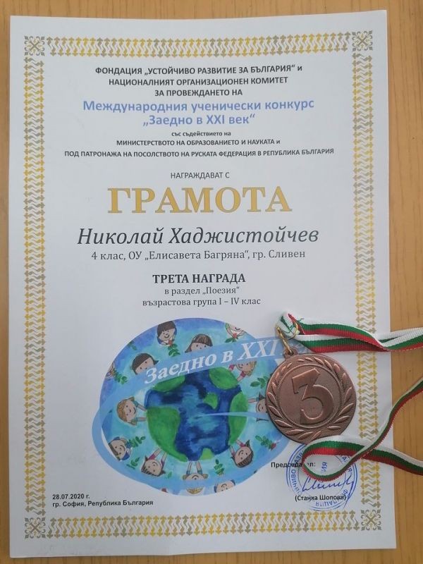 Поздравления за Николай Хаджистойчев, който постигна отново успех! Негово е третото място в Международния ученически конкурс "Заедно в XXI век" в категория "Поезия".