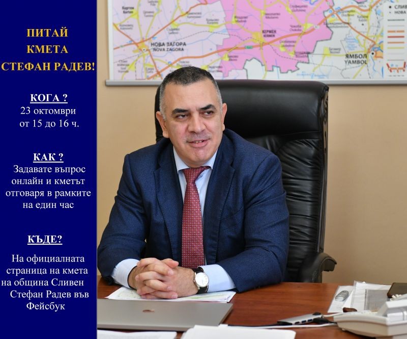 Кметът на Сливен Стефан Радев ще отговаря на въпроси, зададени директно на официалната му страница във Фейсбук на 23 октомври от 15 до 16 часа. Адресът е : https://www.facebook.com/stefanradevsliven/