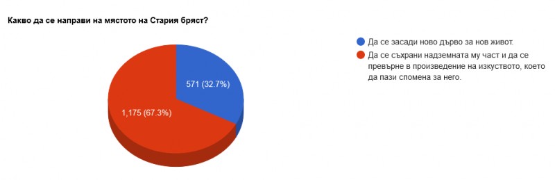 1746 души са гласували до момента в анкетата за Стария бряст, която стартира в началото на ноември. 67, 3 процента от гласувалите (1, 175) са дали своите предпочитания на същото място да бъде изработено произведение на изкуството. 32, 7 процента (571) души са дали своя глас да бъде засадено ново дърво.