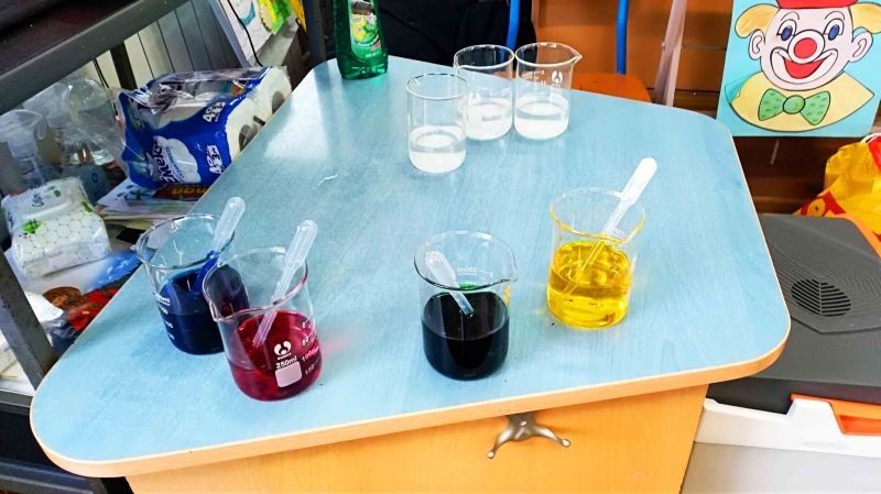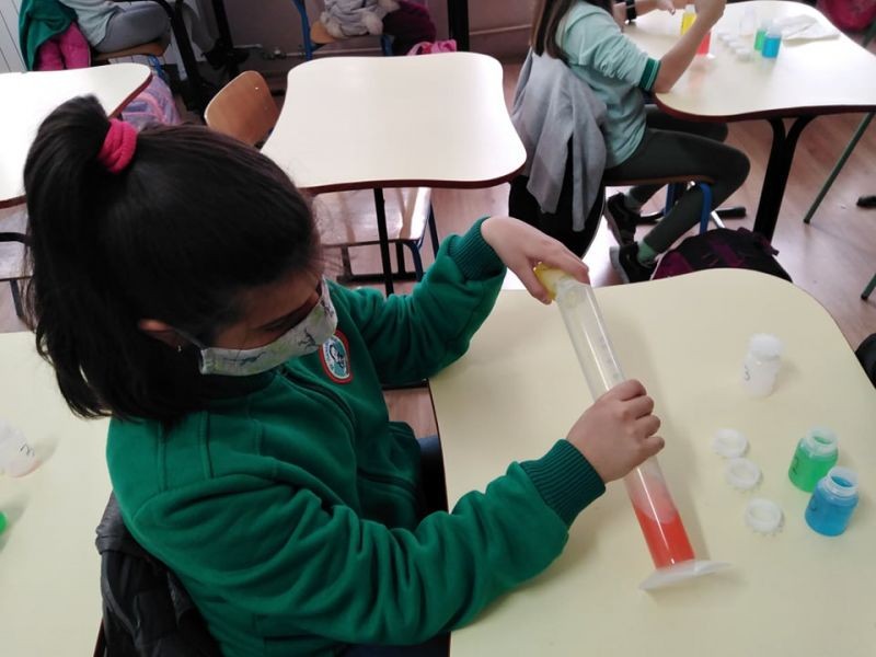 „Цветна кула“ (Физика) – Следвайки точни и ясни инструкции, децата създадоха цветна кула от течности, като ги подредиха вертикално в ред на намаляваща плътност.