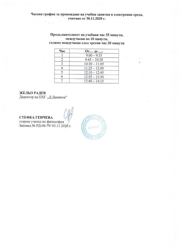 Учебните занятия в ПХГ "Дамян Дамянов" ще се провеждат с утвърденото седмично разписание при следния часови график: