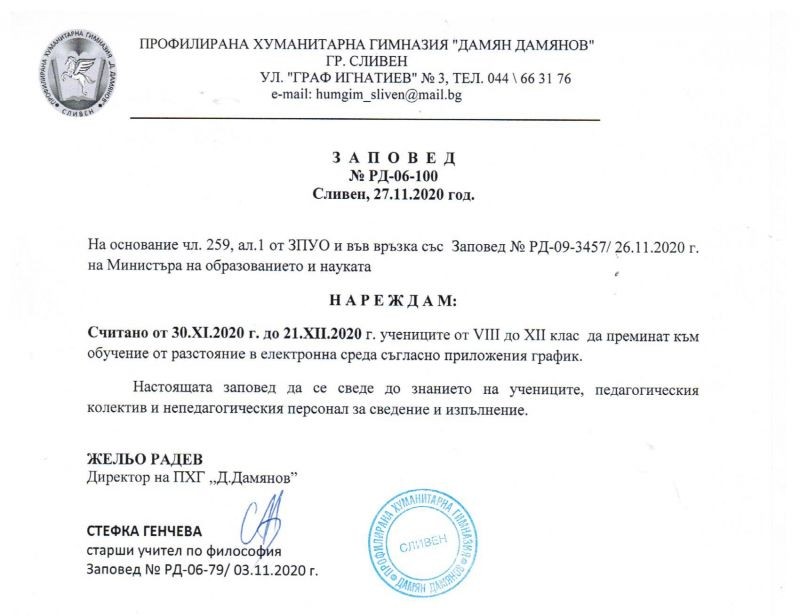 Със заповед на Министъра на образованието и науката от 26.11.2020 г., от 30 ноември обучението на учениците ще се осъществява в електронна среда.