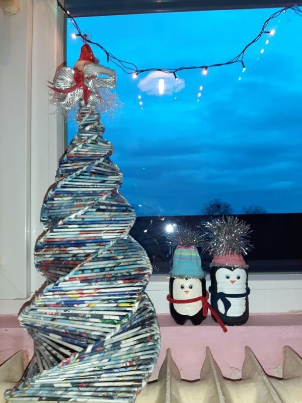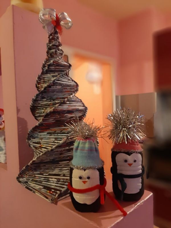 Трето място в класацията заема Ивелина Пашова, която е направила две пингвинчета от пластмасови шишета, чорап и акрилни бои, висулка от стара изгоряла крушка и коледна елха от стари брошури."