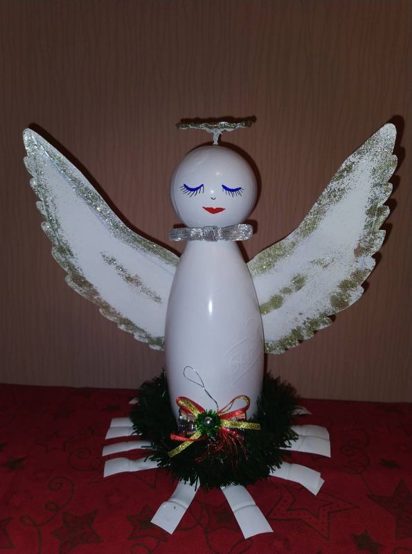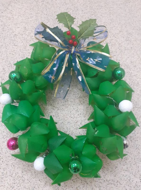 Второто място е за Мария Василева. Тя е създала венец от пластмасови бутилки и коледно ангелче от бутилка декорирано с остатък от стар гирлянд, топка за игра и пластмасов капак от кутия за играчки.