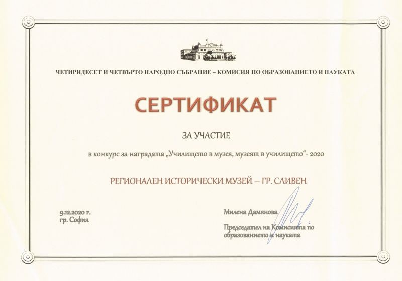 Днес Регионален исторически музей "Д-р Симеон Табаков" получи сертификат за участие във второто издание на конкурса „Училището в музея, музеят в училището“, организиран от Комисията по образованието и науката към Народното събрание.