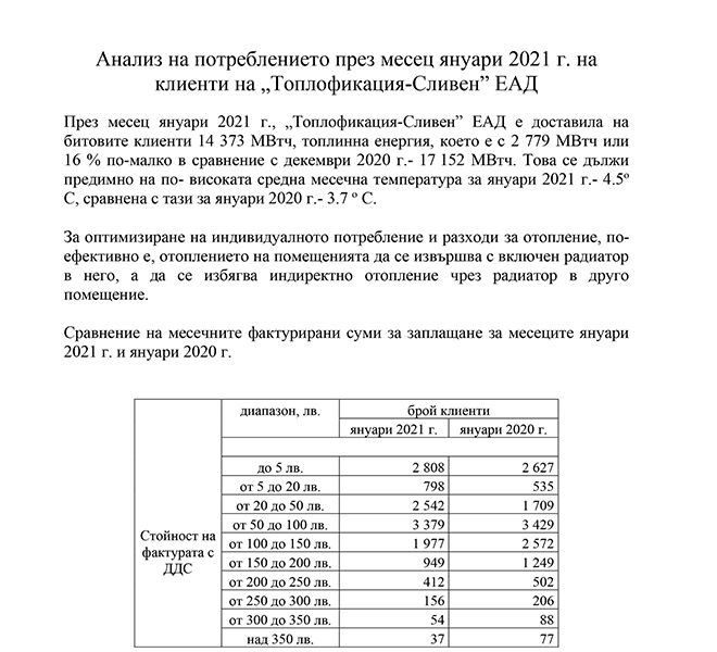 Анализ на потреблението през месец януари 2021 г. на клиенти на „Топлофикация-Сливен” ЕАД