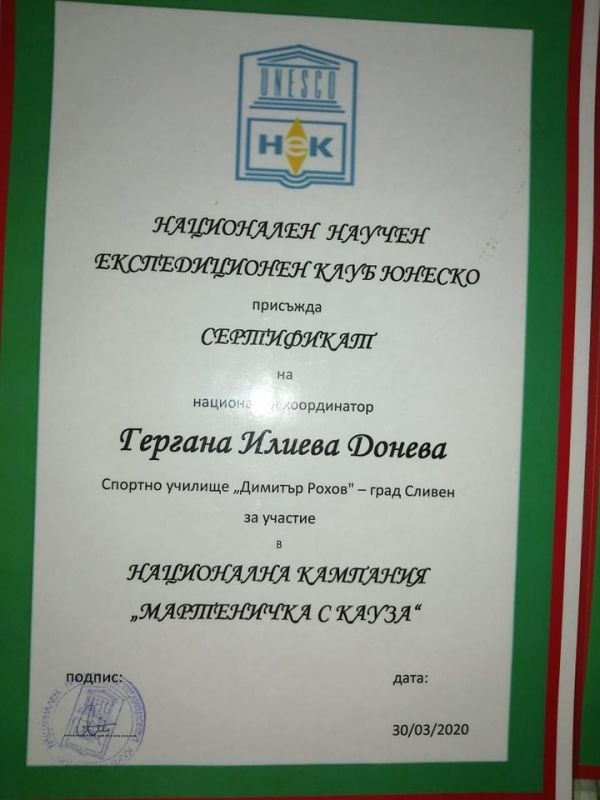 Спортно училище „Димитър Рохов“ Сливен, най-отговорно се включи в благотворителната инициатива – „Мартеничка с кауза 2020“. Бяха направени мартенички и мартенски сувенири от учениците. В училището се откри базар, чрез който се набраха средства за направата на SOS жилища за майки и деца намиращи под тормоз. Участието на учениците в кампанията за борба срещу агресията у дома е и превенция срещу агресията на деца в училище.