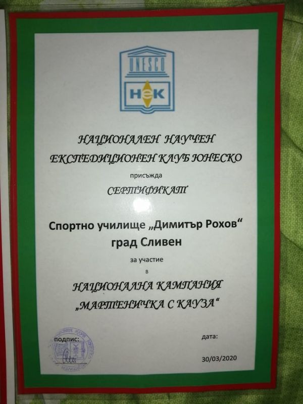 Спортно училище „Димитър Рохов“ Сливен, най-отговорно се включи в благотворителната инициатива – „Мартеничка с кауза 2020“. Бяха направени мартенички и мартенски сувенири от учениците. В училището се откри базар, чрез който се набраха средства за направата на SOS жилища за майки и деца намиращи под тормоз. Участието на учениците в кампанията за борба срещу агресията у дома е и превенция срещу агресията на деца в училище.