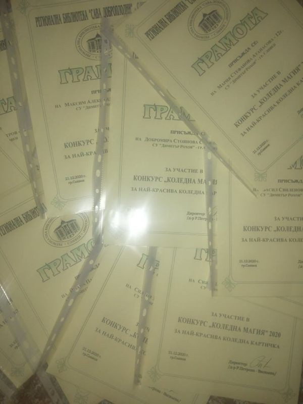 Регионална библиотека „Сава Доброплодни“ Сливен стартира програмата „Коледа в библиотеката“ 2020. В конкурса за Коледна картичка и оригинално коледно пожелание „Коледна магия“ учениците от нашето училище взеха участие с 30 картички. Те можеха да се видят на организирана изложба в библиотеката. За отличното представяне децата получиха грамоти.