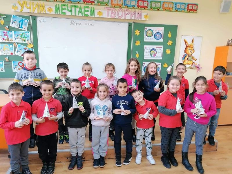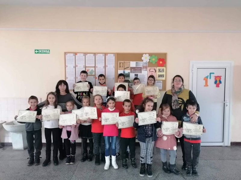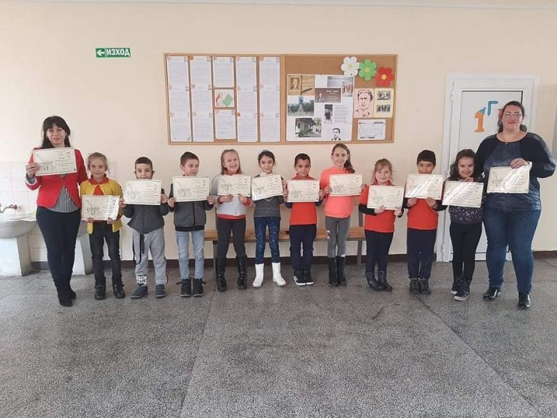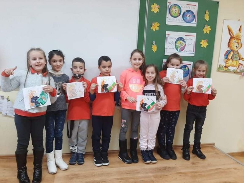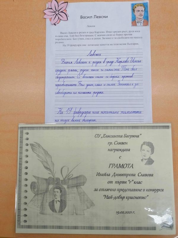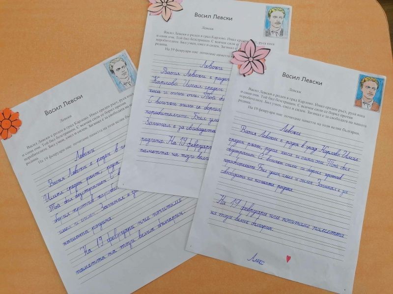Ние, учениците, от първи "Г" клас сме горди твои наследници и изпълняваме завета ти да живеем в чиста и свята република. В твоя чест изписахме слова, прославяйки името ти вовеки!
