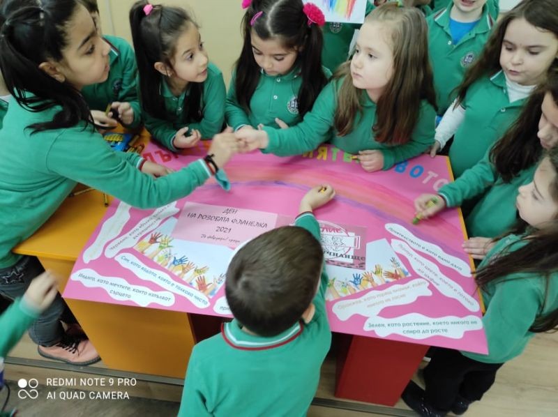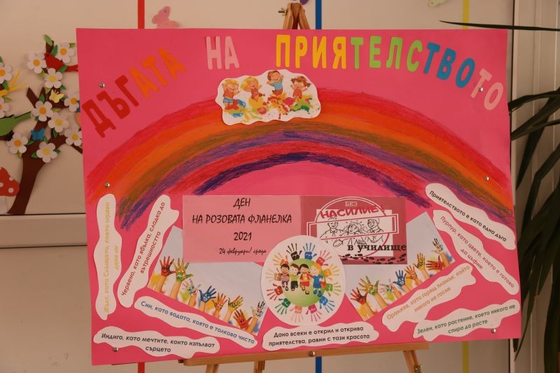 С всяка изминала година отбелязването на този ден се превръща в една добра традиция в нашето училище и подходящ повод да поговорим за приятелството, да обединим усилията си учители, педагогически специалисти, ученици и заедно да се противопоставим на проявите на тормоз и агресия. Да превърнем добрите послания, които споделят нашите ученици за приятелството в норма на поведение, за да бъдат по-добри чрез общуване, приятелство и толерантност и да се противопоставят на проявите на агресия и тормоз.
