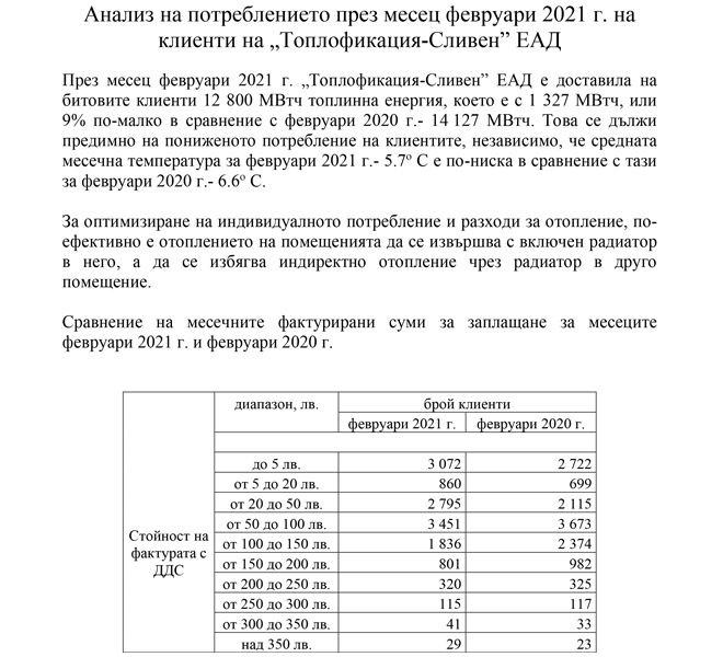 Анализ на потреблението през месец февруари 2021 г. на клиенти на „Топлофикация-Сливен” ЕАД