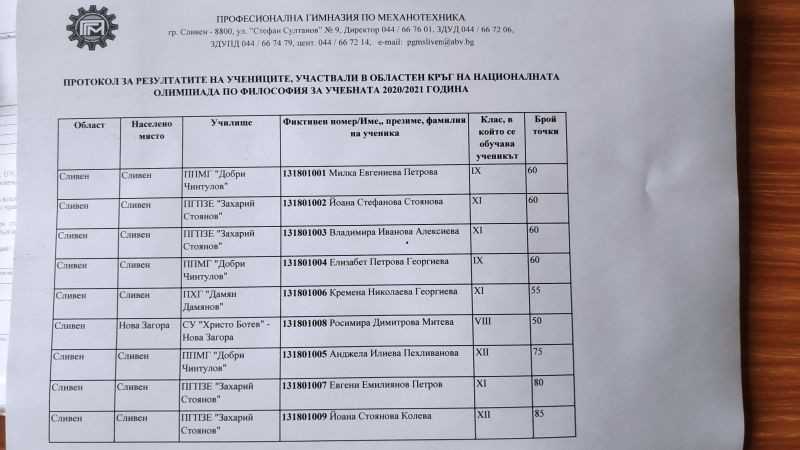 ПРОТОКОЛ ЗА РЕЗУЛТАТИТЕ НА УЧЕНИЦИТЕ УЧАСТВАЛИ В ОБЛАСТЕН КРЪГ НА НАЦИОНАЛНАТА ОЛИМПИАДАТА ПО ФИЛОСОФИЯ ЗА УЧЕБНАТА 2020/2021