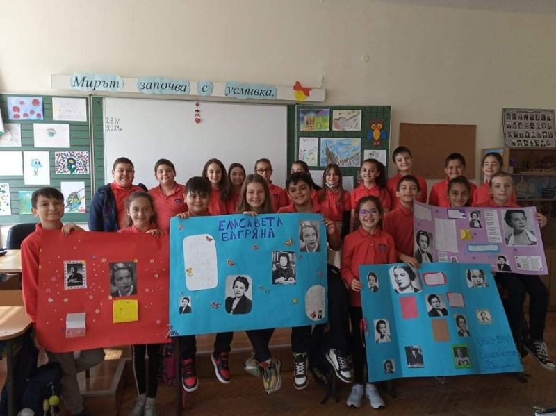 Учениците от 4. клас се включиха в отбелязването на патронния празник на училището с рецитали по стихове на поетесата Елисавета Багряна. Те изпълниха някои от най-силните произведения на авторката по звуците на училищния химн и други любими песни. Проявиха креативност и инициатива при изработката на лапбук и табла, посветени на живота и творчеството на Багряна.