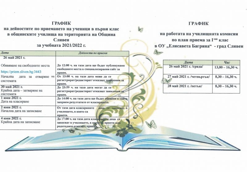 График на дейностите по прием на ученици в 1 клас за уч. 2021/2022 г.