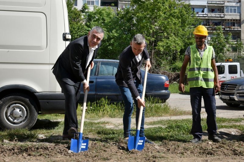 Със символична първа копка днес започна благоустрояването на междублокови пространства в квартал „Сини камъни“. На събитието присъстваха кметът на община Сливен Стефан Радев, управителите на фирмата-изпълнител Мартин Стефанов и на фирмата за строителен надзор на обекта Андон Горнаков.