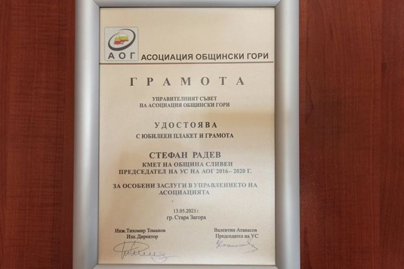 Асоциация „Общински гори“ удостои кмета на Сливен Стефан Радев с юбилеен плакет и грамота за особени заслуги в управлението на асоциацията. Наградата му бе връчена лично от изпълнителния директор инж. Тихомир Томанов. Стефан Радев беше председател на организацията в мандат 2016-2020 г.