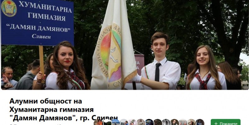 В навечерието на 24 май най-младият учител в Профилираната хуманитарна гимназия „Дамян Дамянов” Габриел Пърев инициира създаването на нейна алумни общност. Гимназията се гордее с всеки от своите бивши възпитаници, а с настоящите работи така, че тази тенденция да се запази. Връзката между днешните и някогашните ученици и учители цели по-добра синергия, интегритет и подкрепа помежду им като се отстояват основните ценности на хуманитаристиката. Базирана в социалната мрежа, от тази общност се очаква лоялност към любимото училище, инициативи, насочени към по-нататъшното му развитие, споделяне на добри практики и идеи, взаимопомощ и сътрудничество в различни посоки. Желанието на Габриел е всеки хуманитарист, който се регистрира в затворената група, да бъде активен - да споделя, да предлага, да организира и да участва във вътрешния живот на общността. Неотдавна, в дни на изпитания пред училището, толкова много настоящи и бивши негови възпитаници показаха решимост да го защитят и запазят. Обединението и активното участие в тази общност се надяваме да бъде една от важните предпоставки това да не се случи и в бъдеще. Затова каним всички наши бивши и настоящи ученици, учители и служители да станат членове на алумни общността на Профилираната хуманитарна гимназия "Дамян Дамянов" гр. Сливен!