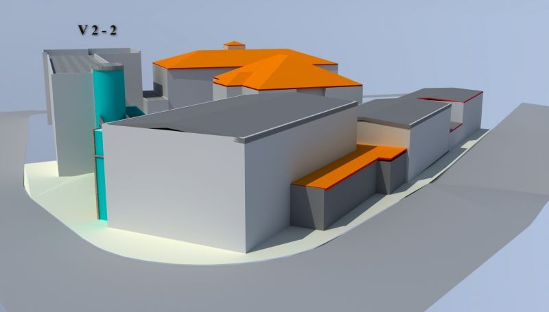 ПРЕМАХВАНЕ на съществуващата сграда. На нейно място се предвижда изграждане на два изцяло нови физкултурни салона, с два отделни самостоятелни входа на юг откъм вътрешния двор на училищата. В този вариант се предвижда изграждане на един голям физкултурен салон с размери 29,6 м х 11,5 м и височина 11,5 м, проектиран по размери за следните възможности за спортове: волейбол, тенис на корт, тенис на маса, гимнастична площадка. Залата е оразмерена включително и за баскетбол. Към физкултурния салон има предвидена и складова площ. На първо ниво са разположени oще преддверие и общи санитарни помещения (WC) за посетители. Чрез двураменна стълба се достига до второ ниво, където са разположени съблекалните за мъже и жени, със съответните санитарни помещения – WC и душове. На етажа е предвиден и учителски кабинет. И в този вариант се предвижда изграждане на топла връзка (пасарелка) със сградата на ГПЗЕ. Не се предвиждат други учебни помещения (кабинети) на второ ниво. Би могло стълбата да се доразвие и да достигне до покривно ниво за изграждането на открита тераса.