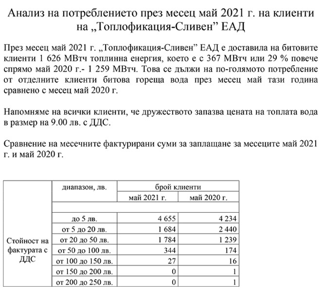 Анализ на потреблението през месец май 2021 г. на клиенти на „Топлофикация-Сливен” ЕАД