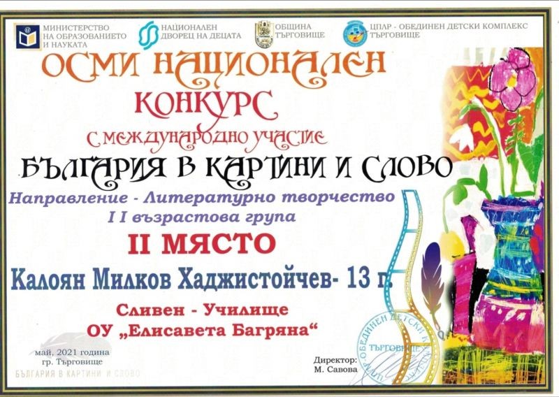 Добрите новини около Калоян Хаджистойчев не спират. Ученикът от 6. "б" клас се класира на второ място в Осмия национален конкурс с международно участие "България в картини и слово".