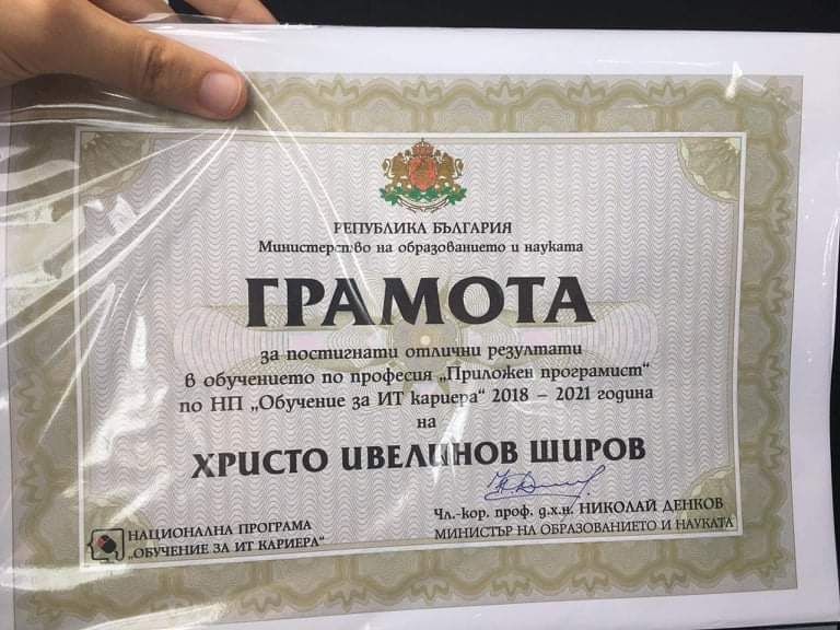 Отличници по професия „Приложен програмист“ с грамоти от МОН