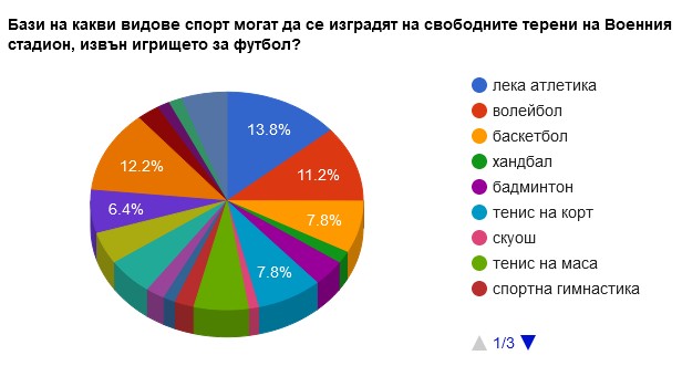 Според резултатите, 2481 души са участвали в анкетата. Най-силна подкрепа е получила леката атлетика – 342 души, което прави 13.8 %. 303 или 14.2 % са предпочели да бъде изградена изкуствена стена за боулдър катерене. 279 души или 13 % са избрали изграждане на волейболно игрище. Еднакъв е процентът на анкетираните, които са посочили вариантите за изграждане на тенис на корт и за баскетболно игрище – 193 души или 7.8 %. Опцията „други“ са предпочели 5.5 % /136 души/. Равен брой гласове са получили и предложенията за боулинг и кегелбан и тенис на маса – 6.4 % /159 души/. Следват спортна стрелба – 5.5 % /137 души/ и стрелба с лък – 4.8 % /118 души/. 57 души или 2.3 % са изразили предпочитания за изграждане на база за спортна гимнастика. Сред посочените предложения от граждани попадат още художествена гимнастика с 2.3 % /56 души/, спортна акробатика – 1.5 % /36 души/, бадминтон – 3.9 % /96 души/, хандбал – 1.8 % /45 души/, скуош – 1.2 % /30 души/. 66 души от анкетираните смятат, че е необходимо изграждането на база за бойни спортове и източни бойни изкуства, което прави 2.7 %. За създаване на подходящите условия за спорта фехтовка предпочитания са изразили 1.6 % или 39 души, тежка атлетика са маркирали 37 души или 1.5 %.
