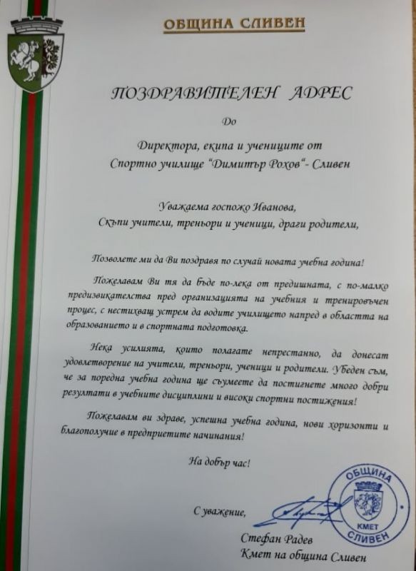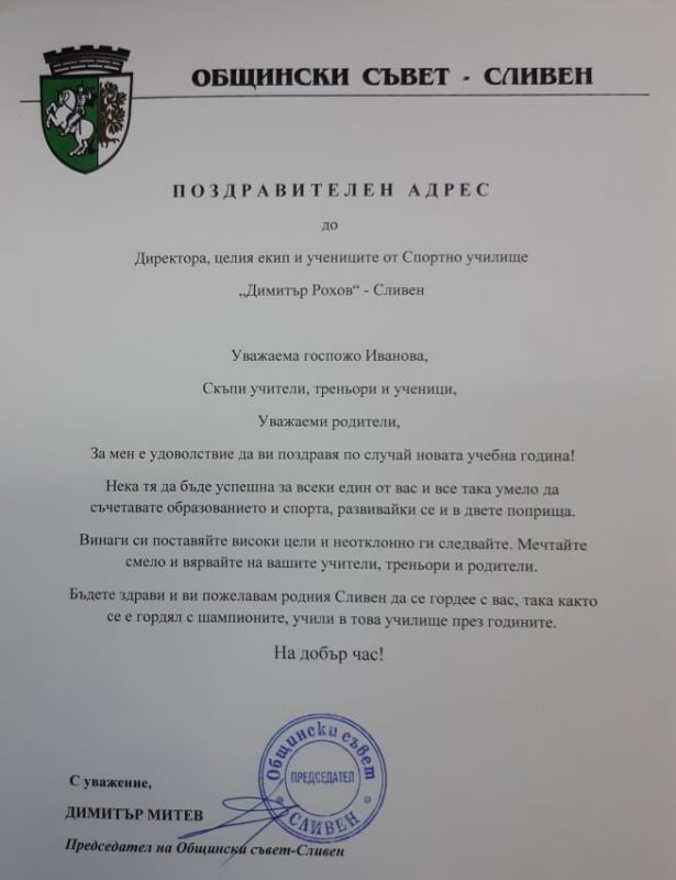 Поздравителни адреси Спортно училище получи от Кмета на Община Сливен, от Областният управител на Община Сливен, както и от Общински съвет - Сливен.