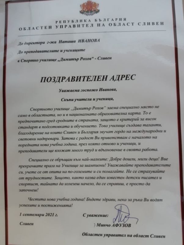 Поздравителни адреси Спортно училище получи от Кмета на Община Сливен, от Областният управител на Община Сливен, както и от Общински съвет - Сливен.