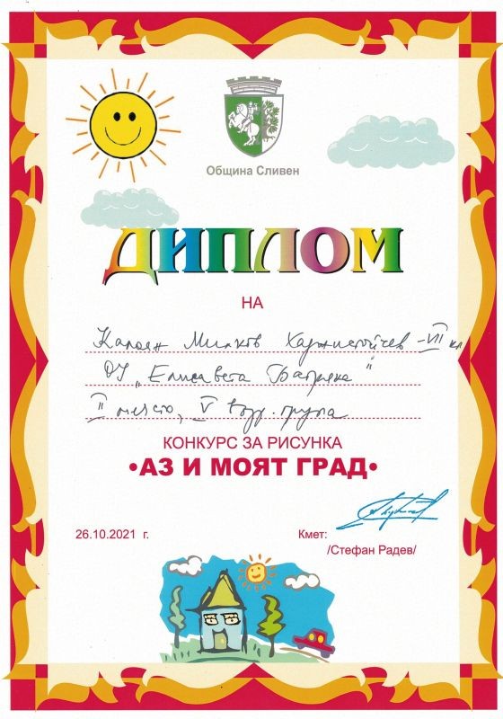 Ученици от ОУ „Елисавета Багряна“ в Сливен бяха наградени в традиционния конкурс за детска рисунка „Аз и моят град“. Проявата беше организирана от Община Сливен, в партньорство с Художествена галерия „Димитър Добрович“.
