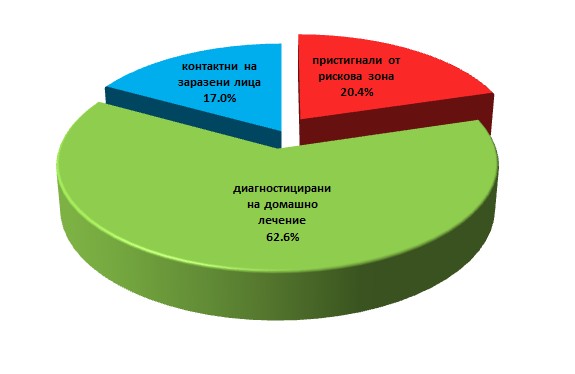 Към момента под домашна карантина са 1 356 жители на областта, като близо 63 на сто от тях са болни, провеждащи лечението си в домашна изолация, под наблюдението на личния лекар. Останалите карантинирани са били контактни на заразени или са пристигнали от рискова зона.
