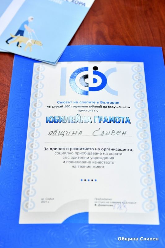 Община Сливен получи юбилейна грамота и почетен знак от Съюза на слепите в България