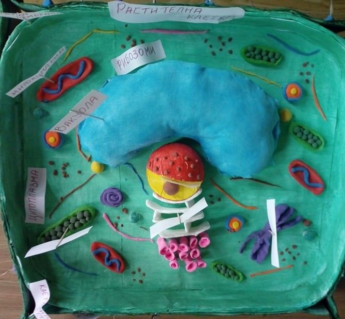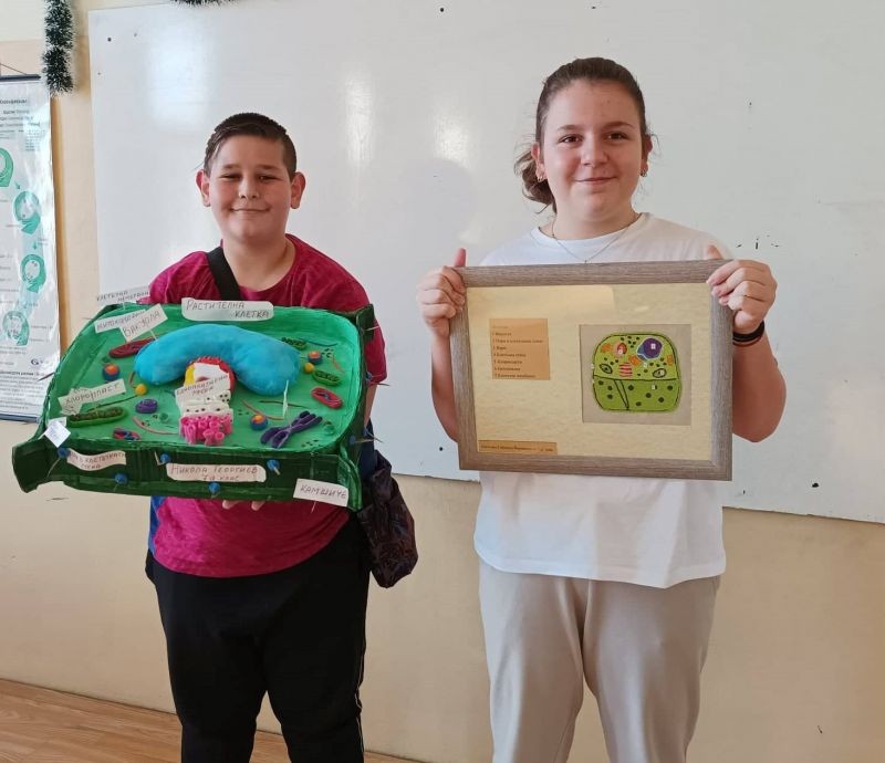 Седмокласниците Габриела Димитрова и Никола Георгиев представиха своите макети за устройството на растителните клетки, които използваха като нагледно средство за да затвърдят знанията си.