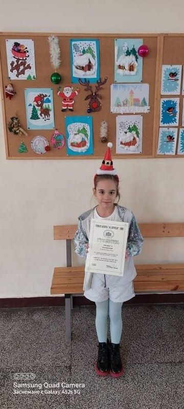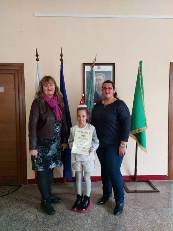 Александра Колева от 2. "г" клас от ОУ "Елисавета Багряна" беше отличена в конкурса за коледна картичка и оригинално коледно пожелание „Коледна магия“ – 2021. Тя получи поощрителна награда за коледно пожелание и беше поздравена от директора на училището г-жа Величка Христова.
