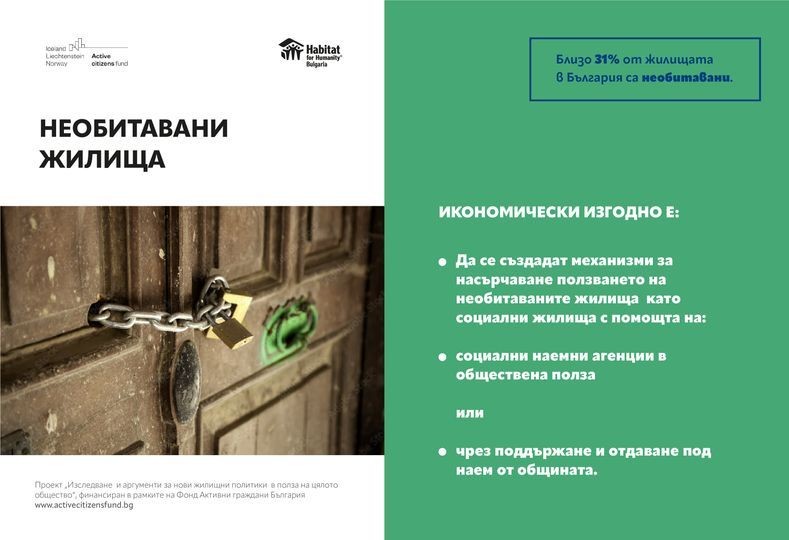През последното десетилетие все по-голяма част от българските жилища се превръщат в необитавани. В същото време наличният общински фонд е недостатъчен да покрие жилищните нужди на уязвимите групи от обществото. Необитаваните жилища са неизползван ресурс, който може да реши проблема с този недостиг.