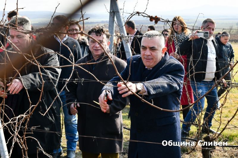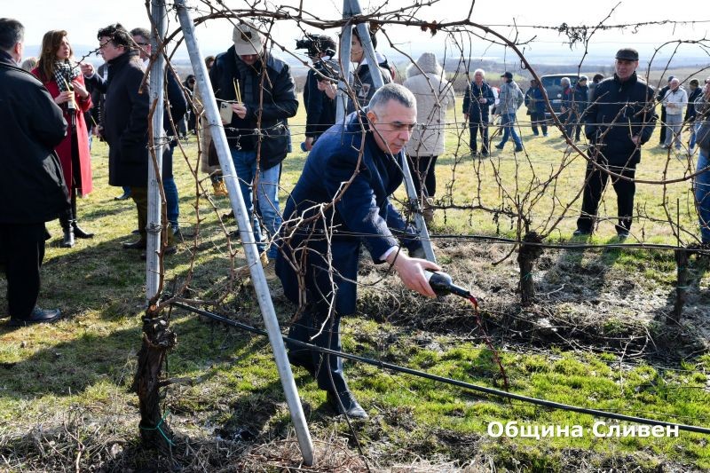 Кметът на Сливен Стефан Радев участва в празничното зарязване на лозята в село Еленово. Ритуалът се организира от Националната лозаро-винарска камара в лозовите масиви на винарска изба „Едуардо Миролио“.
