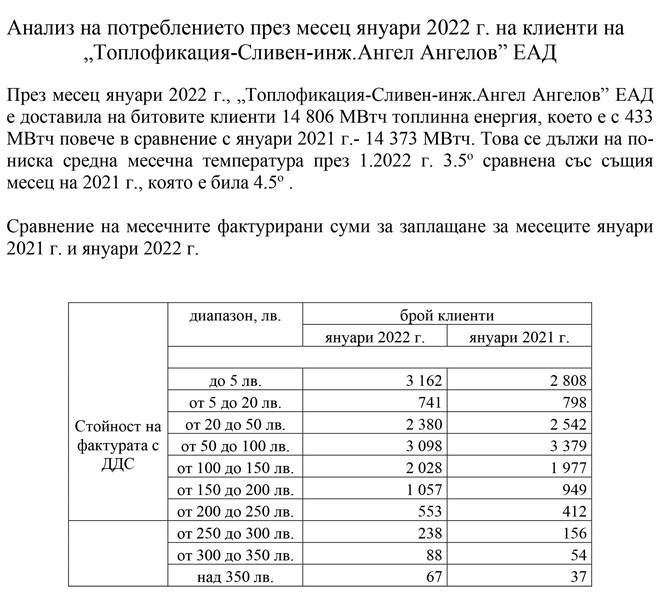 Анализ на потреблението през месец януари 2022 г. на клиенти на „Топлофикация-Сливен-инж.Ангел Ангелов” ЕАД