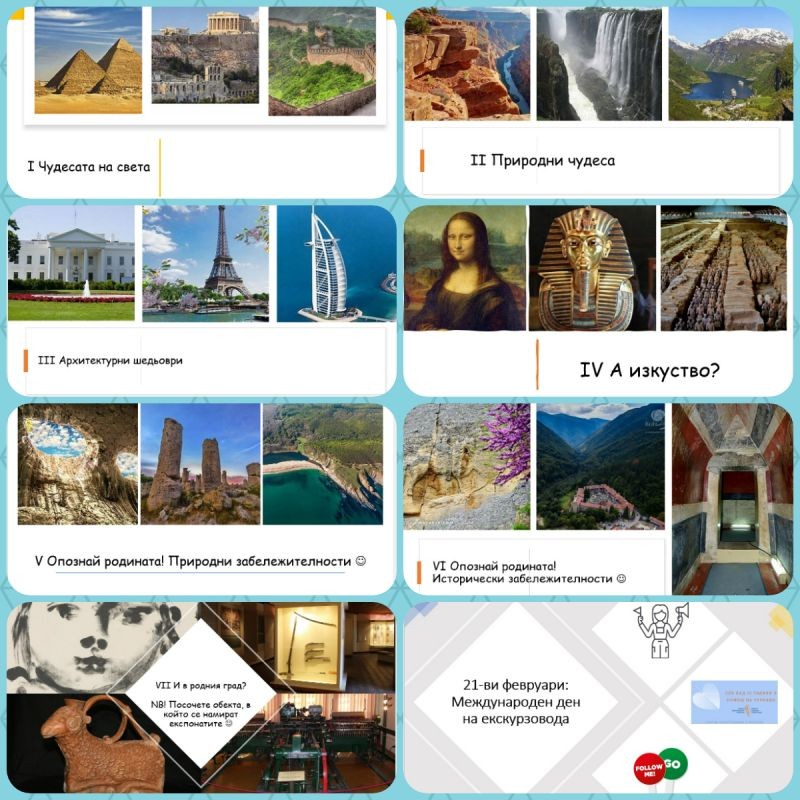 На 21-ви февруари честваме международния ден на екскурзовода. С бъдещите гидове от IX Б клас на Хуманитарна гимназия "Дамян Дамянов" отбелязахме празника с разнообразни и интригуващи дейности. За начало учениците изгледаха с голям интерес част от проявите, подготвени във виртуалното пространство от Съюза на екскурзоводите в България по повод миналогодишния професионален празник и по -специално материал по темата "България - декор на холивудски филми". Най-голямото предизвикателство пред бъдещите водачи беше отборната викторина, в която трябваше да разпознаят разнообразни туристически обекти от близо и далеч, както и да отгатнат местоположението им. Накрая учениците трябваше да се ориентират по карта за някои от архитектурните забележителности в родния Сливен и да документират откриването им със селфи. По традиция денят на екскурзовода – 21 февруари е очакван, вълнуващ и професионален празник за учениците от паралелките със специалност „Екскурзовод“ в Хуманитарна гимназия „Дамян Дамянов“.