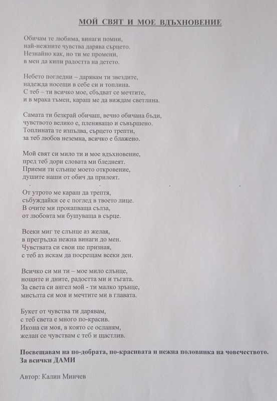 За поредна година инж. Калин Минчев от Дирекция „Общинска инфраструктура“ в Община Сливен, посвети свое стихотворение на дамите за 8 март, когато се чества Международният ден на жената. То носи заглавието „Мой свят и мое вдъхновение“. Вече няколко години авторът на стиховете споделя своето вдъхновение и поздравява на този ден по-добрата, по-красивата и нежна половина на човечеството.