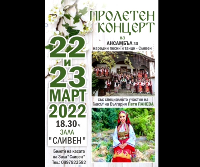 Ансамбълът за народни песни и танци - Сливен ще изнесе два пролетни концерта през март - на 22 и 23. Те ще се проведат в зала "Сливен" от 18,30 ч. и в двата дни. Специален гост - Петя Панева - Гласът на България. Билети - на касата на залата.