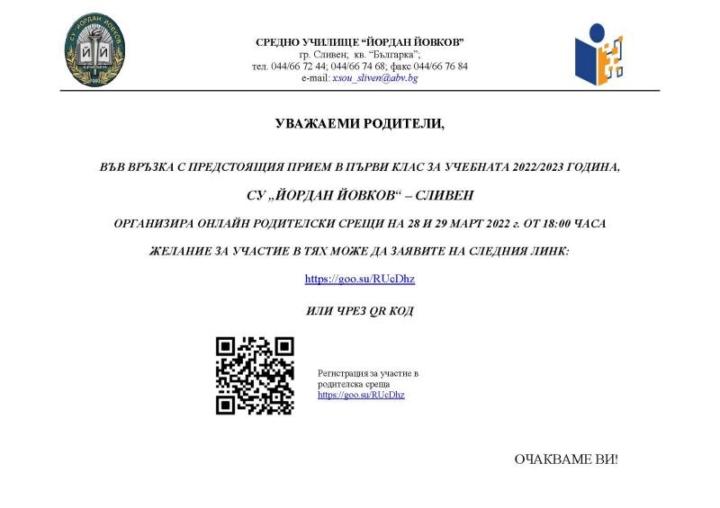 Всички, които са се регистрирали за предстоящите родителски срещи ще получат линк и код за достъп на посочените от Вас имейли в деня на провеждането им до 10.00 ч.