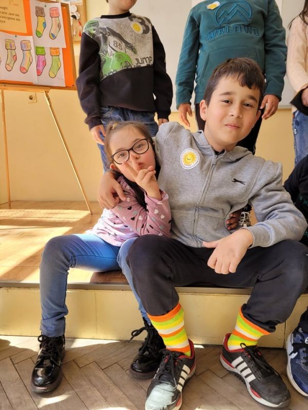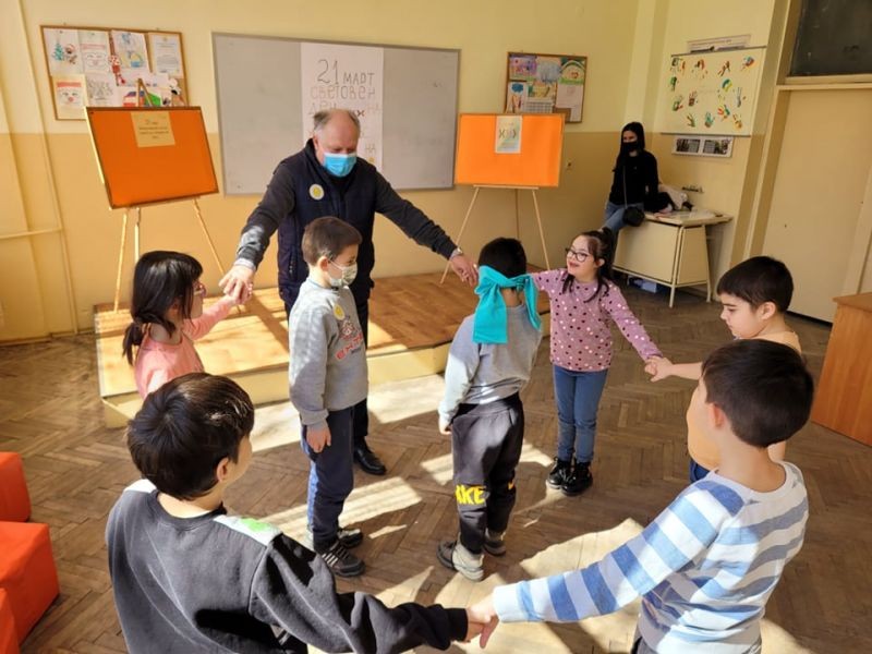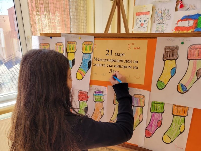 Днес, 21 март учениците от 2 а клас отбелязаха Международния ден на хората със Синдром на Даун. С подкрепата и активното участие на техния учител Мария Монева, помощник на учителя Весела Динева, ресурсния учител Мария Вълева и Ваня Гинчева се проведе занимателен урок, посветен на събитието. С много ентусиазъм и интерес учениците се включиха в проведените занимателни игри и танци. С голяма съпричастност оцветиха един от символите на хората със Синдром на Даун – шарените чорапи, и аранжираха своите табла. Домакин на тържеството беше училищният психолог Марин Пандохов, който се включи активно в проведените дейности.