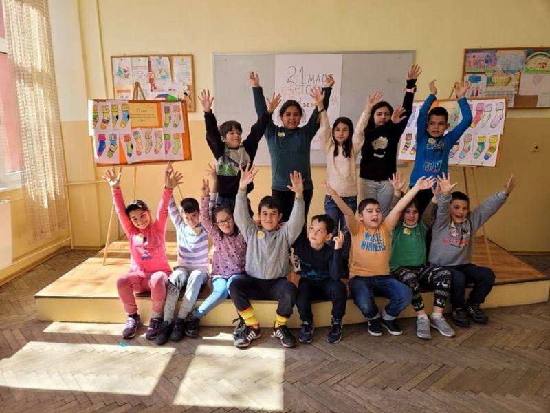 Днес, 21 март учениците от 2 а клас отбелязаха Международния ден на хората със Синдром на Даун. С подкрепата и активното участие на техния учител Мария Монева, помощник на учителя Весела Динева, ресурсния учител Мария Вълева и Ваня Гинчева се проведе занимателен урок, посветен на събитието. С много ентусиазъм и интерес учениците се включиха в проведените занимателни игри и танци. С голяма съпричастност оцветиха един от символите на хората със Синдром на Даун – шарените чорапи, и аранжираха своите табла. Домакин на тържеството беше училищният психолог Марин Пандохов, който се включи активно в проведените дейности.