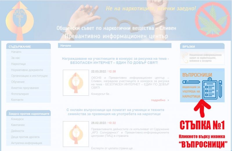 В уеб страницата (https://pits.sliven.net/index.php) на ОбСНВ и ПИЦ – Сливен може да намерите въпросници за ИНДИКАЦИИ НА УПОТРЕБА НА НАРКОТИЦИ .