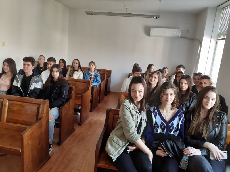Учениците бяха посрещнати от прокурор Ваня Белева - Терзиева и Надя Гангалова, говорител на Окръжен съд Сливен. Господин Мартин Данчев, председател на Окръжен съд Сливен, запозна учениците с разделението на властите, с видовете съдилища, с интересни правни термини като „престъпление“, „присъда“, „наказание“, а госпожа Ваня Белева разясни работата и ролята на прокурора в един съдебен процес. В края на срещата всеки ученик получи подарък - Конституцията на Република България.