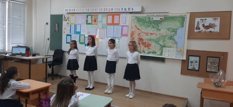 Показаха уменията си да четат гладко и да пишат красиво. Рецитираха стихове за българската реч, четоха мисли за книгата. Бялата дъска светеше от листи с краснопис по стихове на Багряна, илюстрирани и добре представени. Настроение създадоха песните „Сбогом, букварче”, „Първокласно” и „Великденски яйца”.